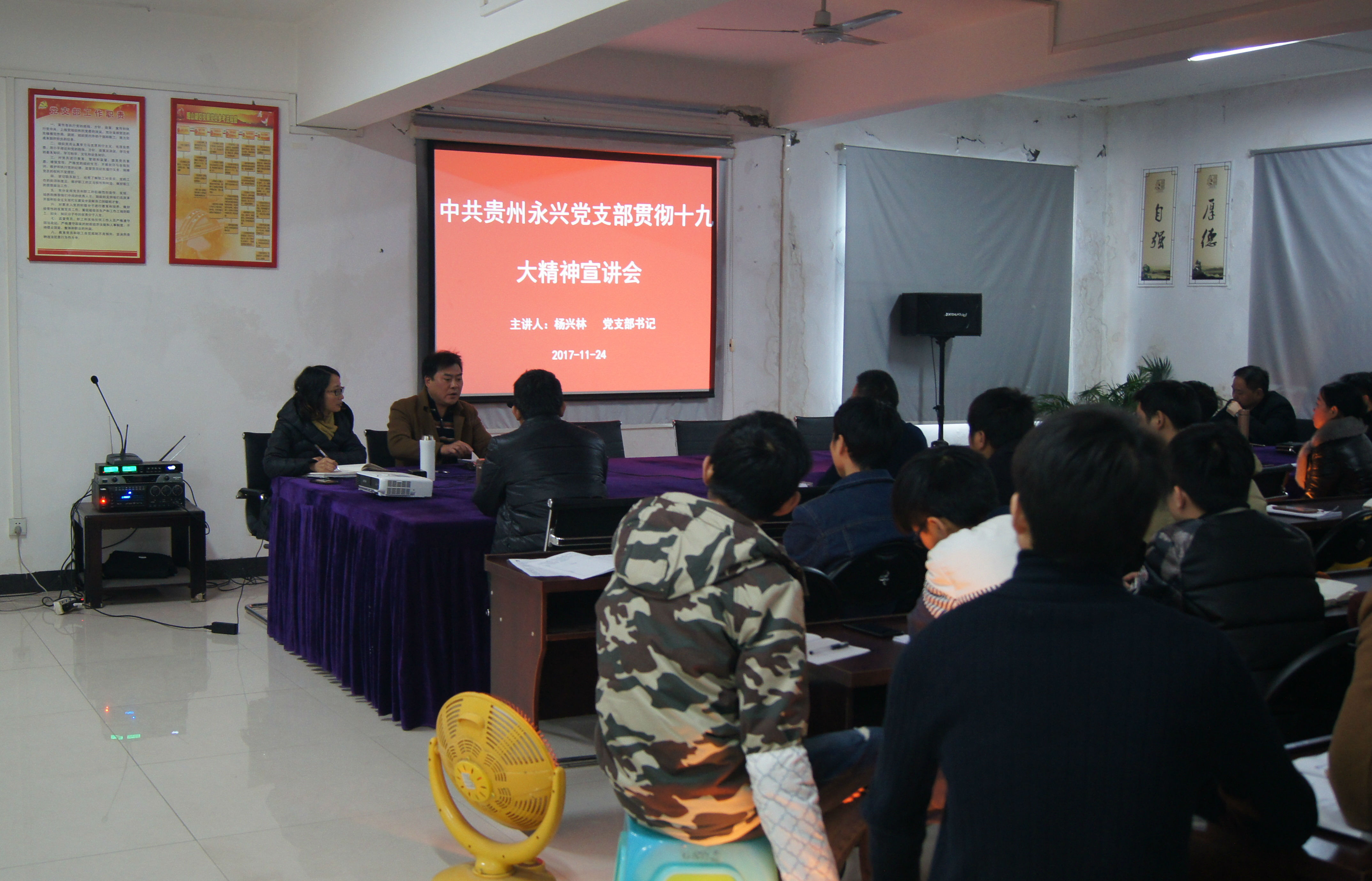 为贯彻落实党的十九大会议精神,永兴党支部于2017年11月24日下午在公司三楼会议室组织公司本部全体员工召开了宣贯党十九大精神的会议。