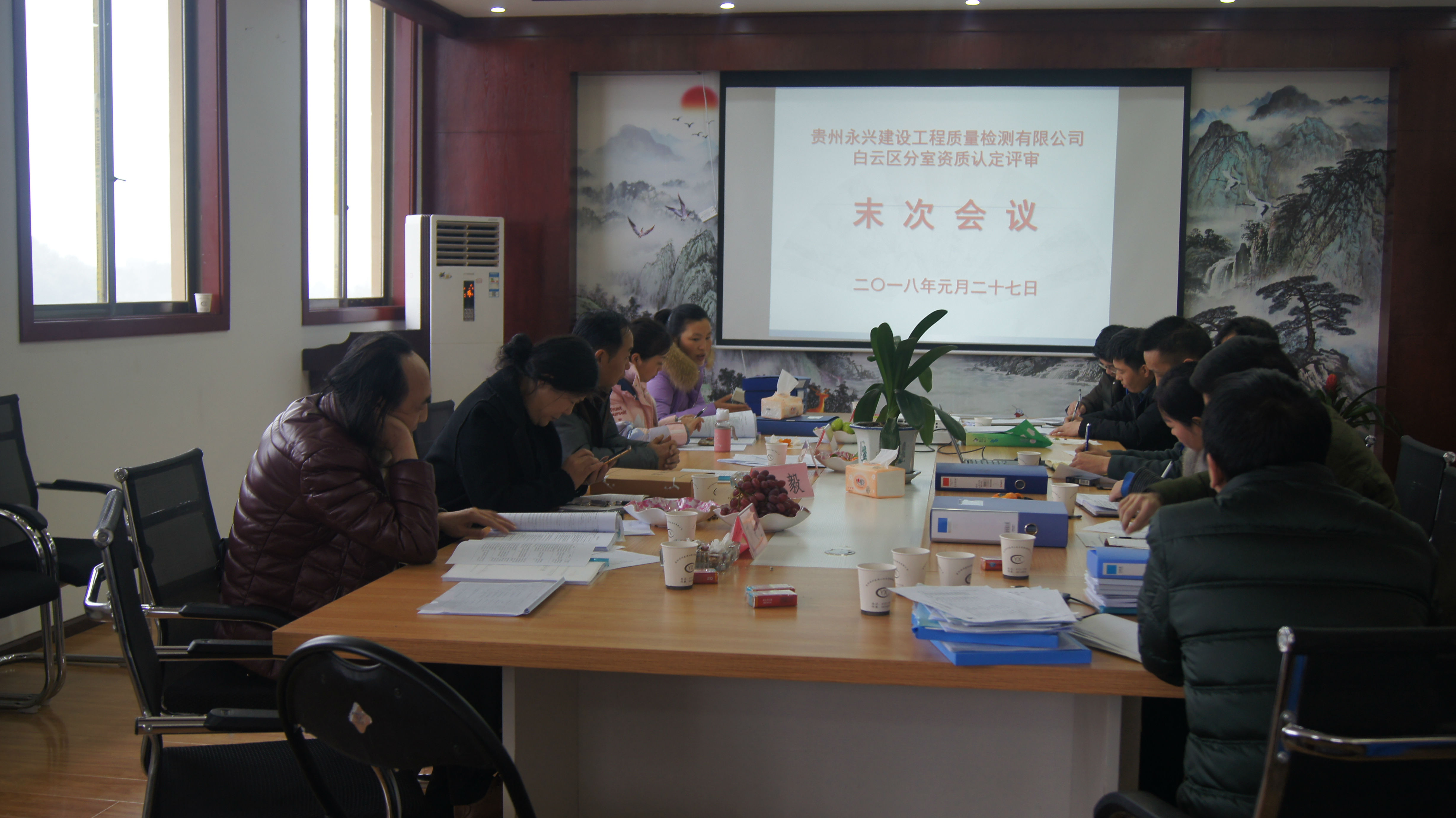 通过公司全体员工近三个月的努力,公司白云区分室2018年1月27日迎来了贵阳市质量监督技术局资质认定评审组的现场评审,评审组专家通过一天的现场评审考核,对公司白云区分室的体系运行情况、环境设施条件、仪器设备配置、申请的检测能力均给予了肯定,评审组也开具了不符合项及提出了相应的整改要求。
