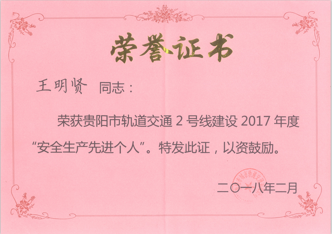祝贺公司轨道交通质量检测现场负责人王明贤被贵阳市城市轨道交通有限公司评为“2号线建设2017年度安全生产先进个人”,也是在贵阳市轨道交通工程质量检测单位中获得该荣誉称号的第一人。