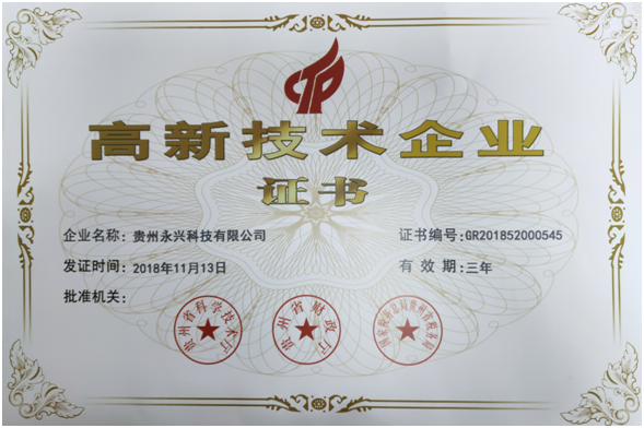 通过不懈努力,永兴科技公司于2018年11月13日获得了由贵州省科学技术厅、贵州省财政厅以及国家税务总局贵州省税务局联合颁发的高新技术企业证书
