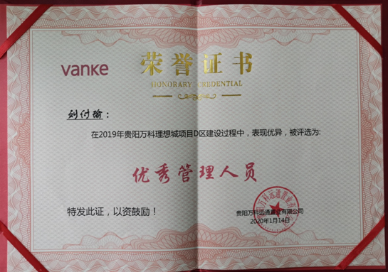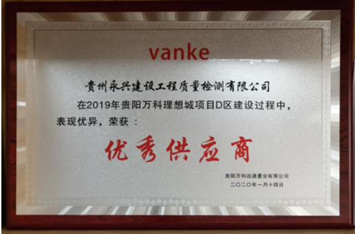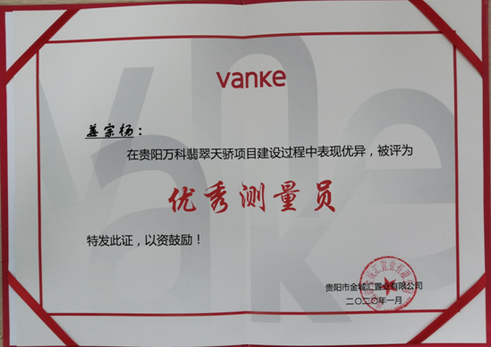 2020年1月16日和17日上午,贵阳万科举行了翡翠天骄、理想城项目2019年度总结表彰大会,公司被评为最佳配合单位及优秀供应商,公司员工姜宗杨被评为优秀测量员,刘付瑜被评为优秀管理人员。这些荣誉会不断激励公司全体员工更加努力,在新的一年以更优质的工作质量和服务质量满足客户的需求,以更扎实的工作态度和严谨的工作作风实现公司2020年的总体目标。