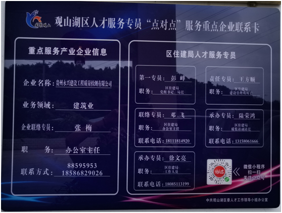 中共贵阳市委、贵阳市人民政府为实施“强省会”五年行动,进一步优化营商环境,强化人才对重点产业发展的引领作用,采取更实际、更实惠、更有效的措施,汇集天下英才,广聚人才市场,推动贵阳贵安城市综合实力实现大跃升,制定了《贵阳贵安人才“强省会”行动若干政策措施》。观山湖区认真贯彻落实这一政策措施,与公司建立了人才服务专员“点对点”服务重点企业联系卡,并委派区住建局人才服务专员对公司进行全面的调研及指导服务。